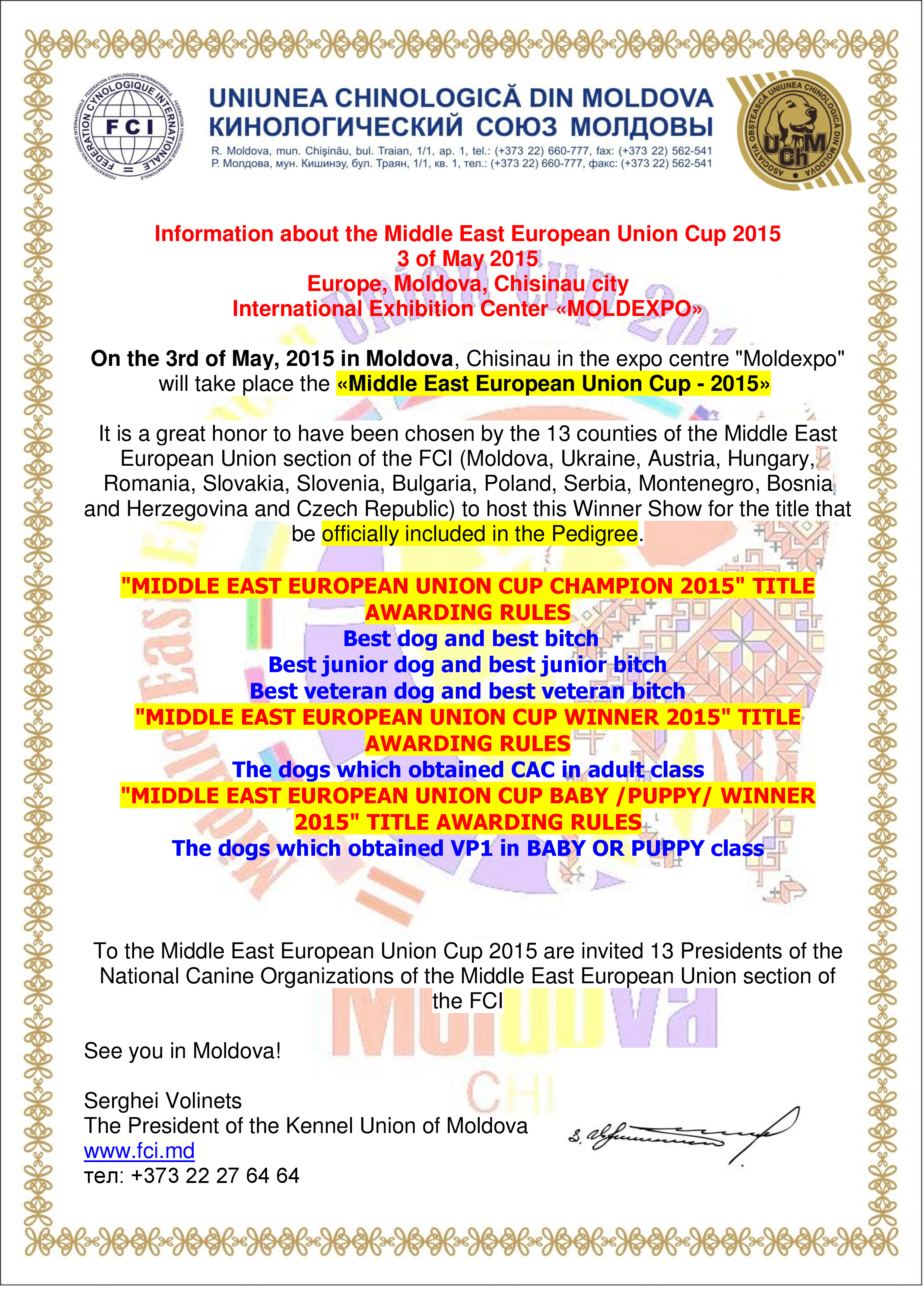 May 3, 2015 in the Republic of Moldova in Chisinau city, by decision of the FCI Middle East European Union Section dated 23 October 2014 will be held the Middle East European Union Cup 2015, with awarding of the title of "Middle East European Union Cup 2015 Winner" and "Middle East European Union Cup 2015 Champion". Founders of this prestigious title are the 13 countries in central and eastern Europe (Moldova, Austria, Ukraine, Hungary, Romania, Slovakia, Bulgaria, Slovenia, Montenegro, Serbia, Poland, Bosnia and Herzegovina and Czech Republic)